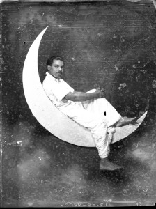 Fig. 06. Kovilpatti artist T. S. Subbiah modelling a studio backdrop, circa 1955. The figure on a crescent moon was a feature of popular photo backdrops in early 20th c. Europe and America.