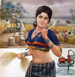 Village woman in the farm with agricultural machines, poster by H.R. Raja.