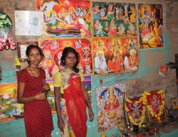 Two girls in Bhatisudha village, MP, with religious posters on their home wall. Photo by Christopher Pinney.