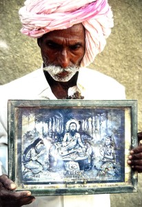 A resident of Nagda, M.P., with a framed picture of Sant Ravidas. Photo by Christopher Pinney.