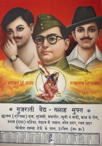 A 1982 calendar showing Chandrashekhar Azad (left), Subhash Chandra Bose and Bhagat Singh, Rastogi Studio. Collection of Christopher Pinney.